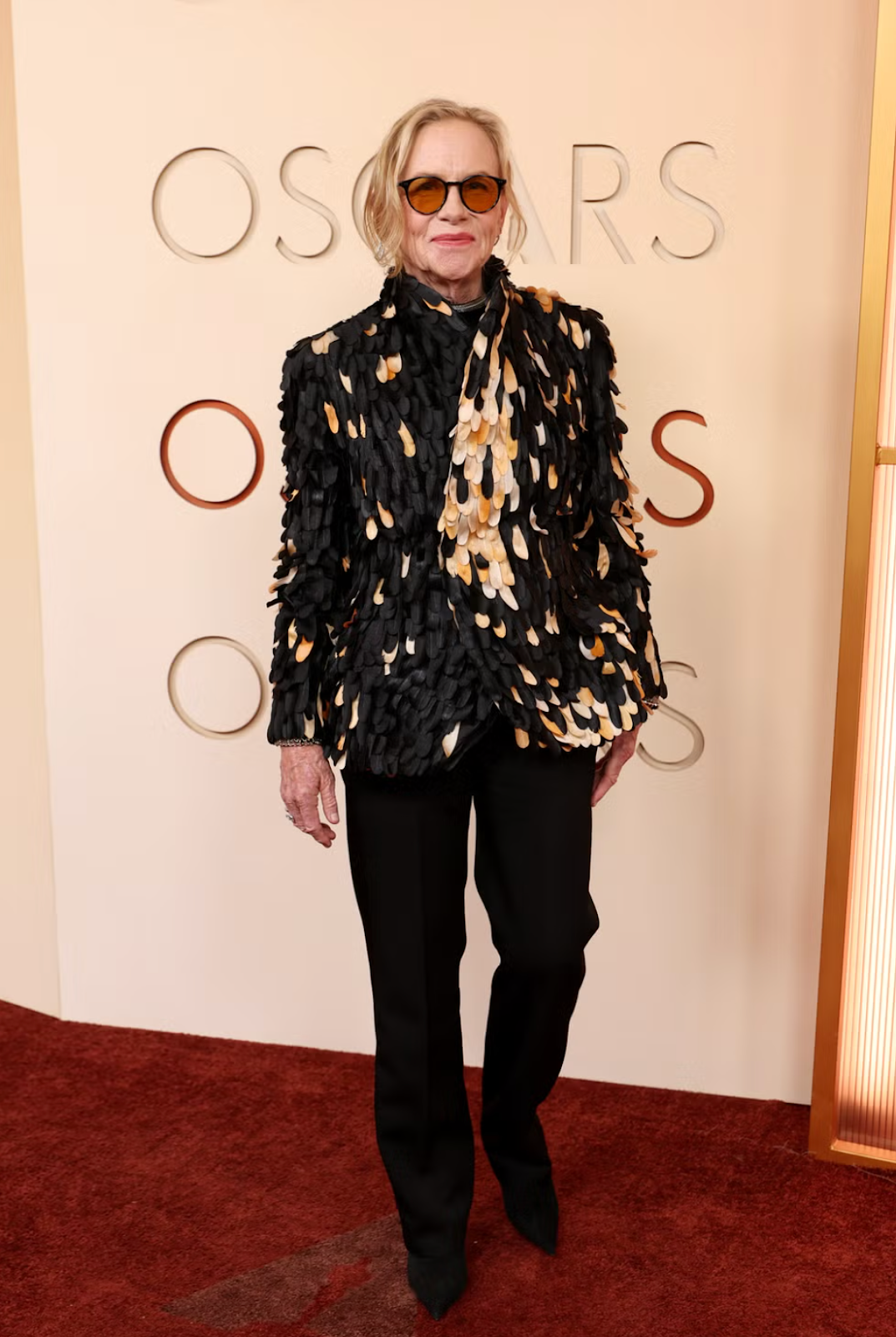 Also on the feather train, Amy opted for a Dior ensemble centred on a bold gold and black textured blazer, finished with brown-tinted sunglasses. Polished, powerful and undeniably cool - the Best Supporting Actress Winner looked every inch the movie star.