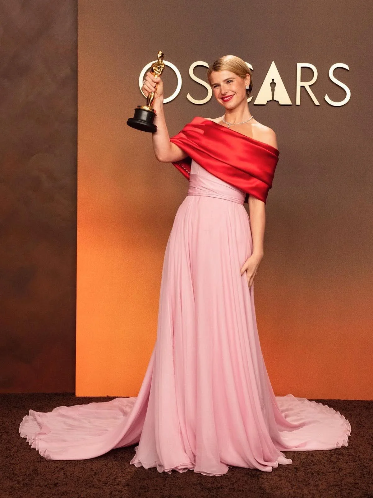 Well-deserved Best Actress winner Jessie Buckley channelled Hollywood icon Grace Kelly in a Chanel gown featuring a red satin draped top and a billowing baby pink chiffon skirt. A striking pop of colour in a sea of black, it was a memorable look for a memorable night for the beloved Irish actress.